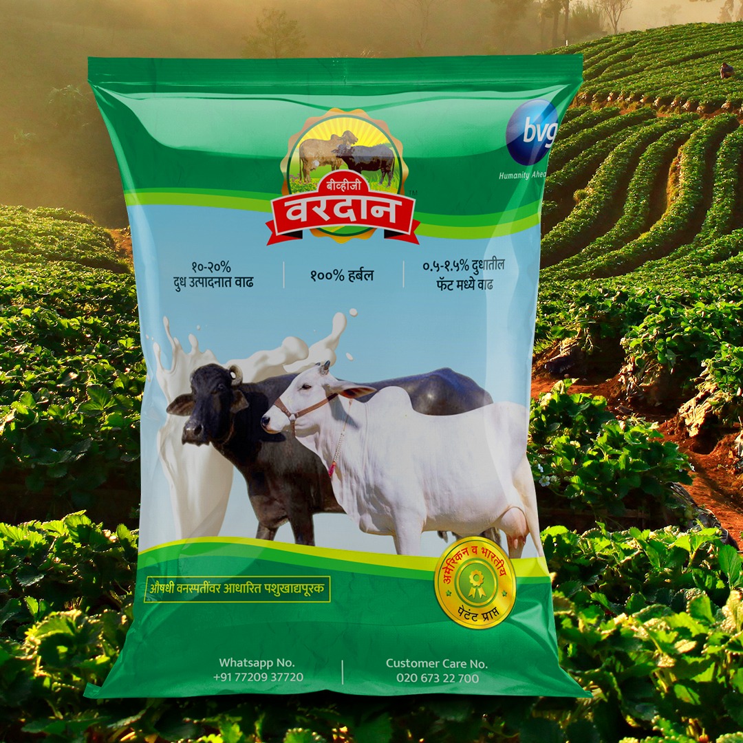 BVG Vardaan  For Enhancing Milk Yield & Improving Quality of Milk Till today single entity of various feed ingredients are being marketed under different brand names for enhancing milk yield and Fat/S.N.F. of Milk. BVG Vardaan is a unique blend of herbal cattle feed supplement for enhancing milk yield and for improving quality (Fat & S.N.F.) of milk at a time.